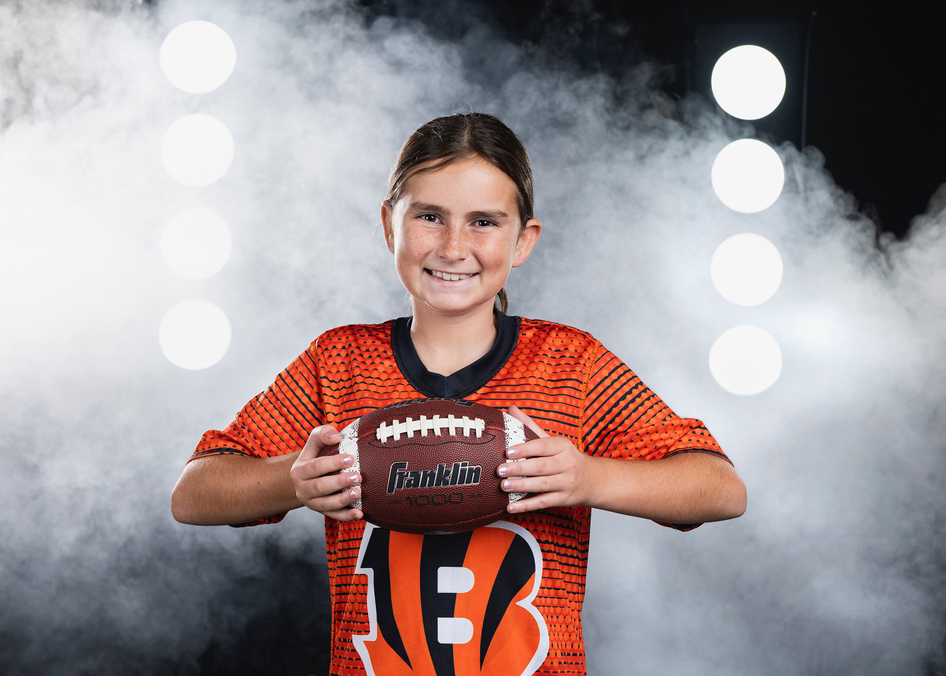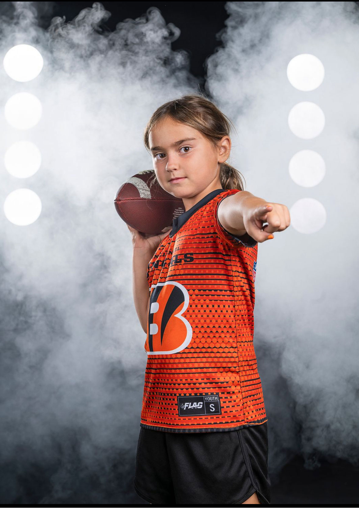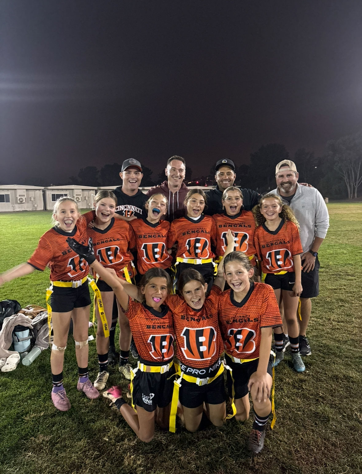 But wait—there’s more! Under Friday night lights, they trade shin guards for flags and become Bengals in the Matt Leinart Flag Football league, with none other than their dad, Coach Tim, at the helm. Lucia’s “Big Bengals” just clinched the championship, while Stella’s “Little Bengals” came runner-up in their first ever season. Coach Dad brings the plays; the girls bring the sparkle (and the touchdowns).